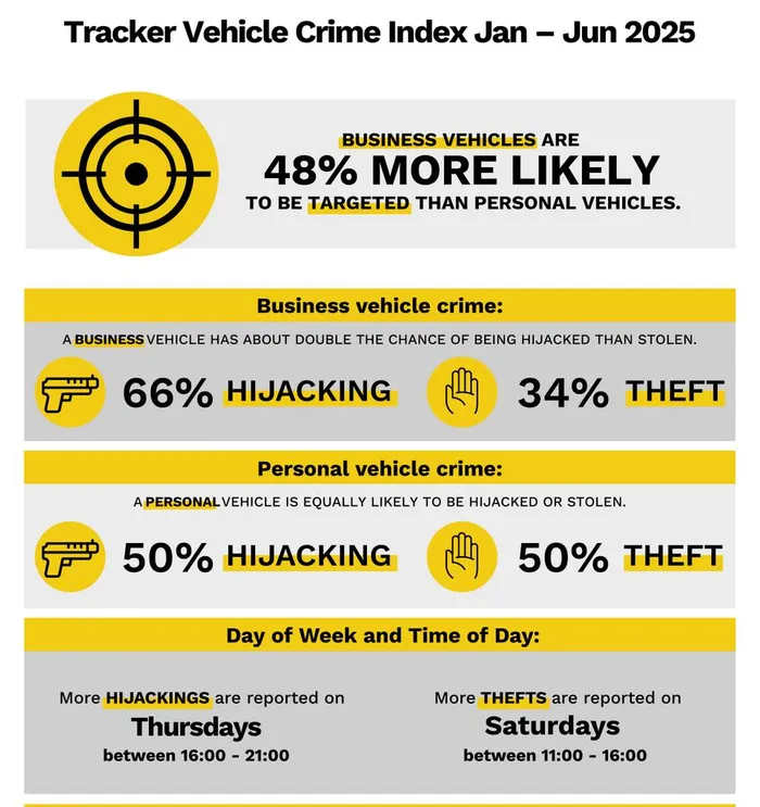 Tracker's vehicle crime statistics from January to June 2025 reveal a telling pattern: business-owned vehicles are 48% more likely to be targeted than personally owned vehicles. Nationally, hijackings of business-owned vehicles occur at nearly double the rate of thefts.