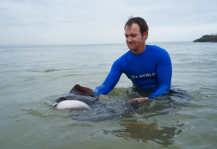South African Association for Marine Biological Research lead aquarist Rob Kyle is releasing one of the three thorntail pups.