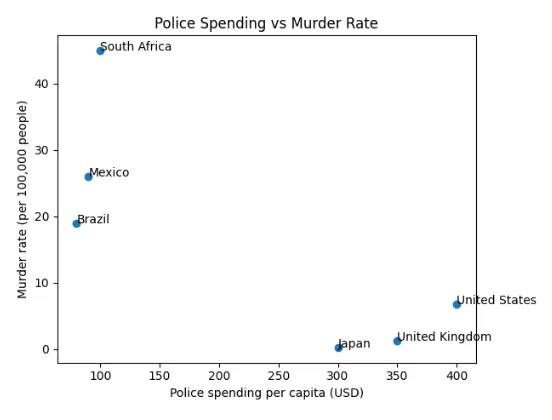 | Country | Population (approximate) | National Police Budget | Per-Capita Police Spend | Murder Rate (per 100k) | Impact |