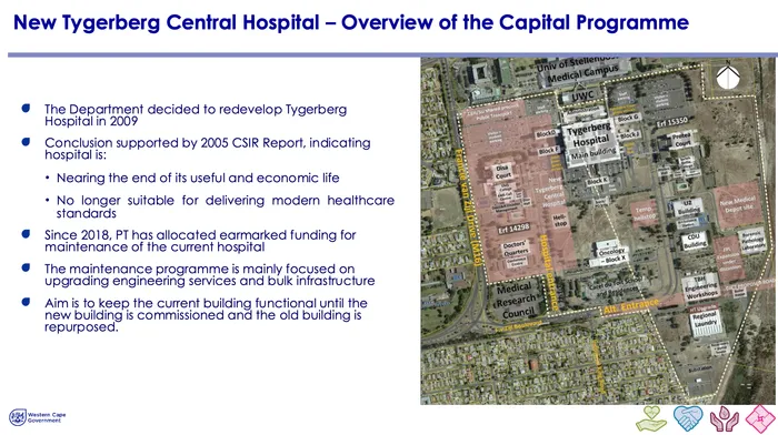 In the presentation, the province informed the committee of a raft of new facilities, including three new mega projects - Klipfontein Regional Hospital, Belhar Regional Hospital, and Tygerberg Central Hospital.
