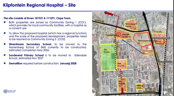 To allow the proposed hospital and the scale of the proposed development, properties need to be rezoned with Silverstream Secondary School, to be moved to the Manenberg School of Skills, currently under construction, and estimated to be completed in May 2026.