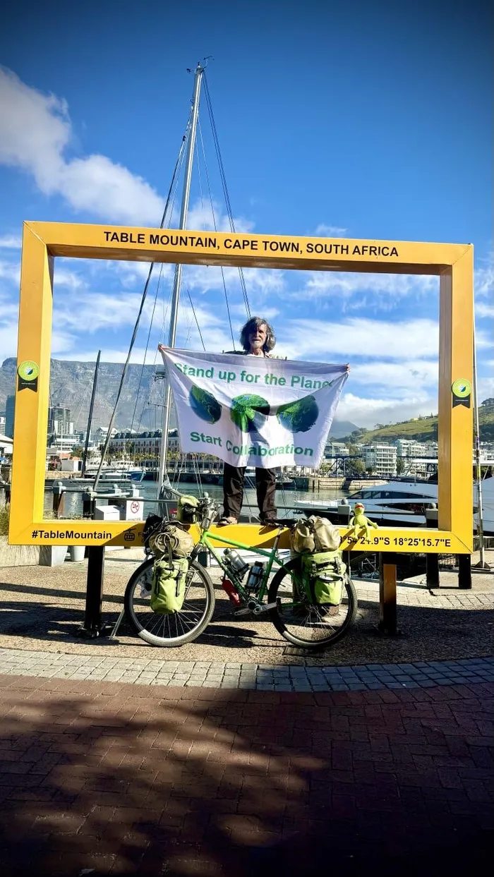 Evertz has been cycling to Cape Town, crossing 25 countries in the process, to connect people and countries for a "cross-cultural-collaboration", in an effort to raise awareness of global warming and climate change.