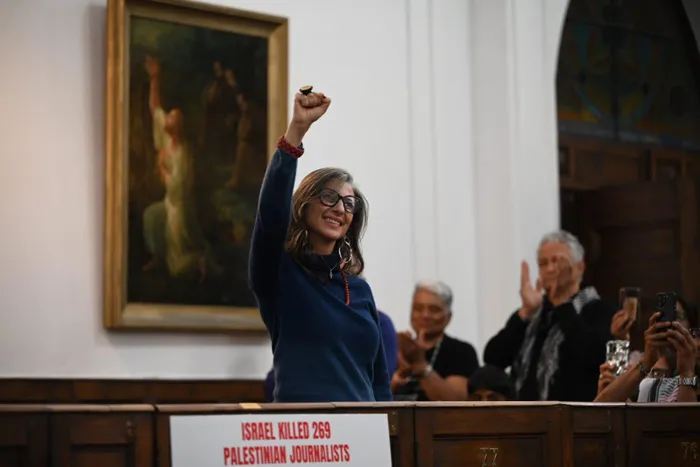 United Nations Special Rapporteur on the Occupied Palestinian Territories, Francesca Albanese, speaks at Die Groote Kerk in Cape Town.