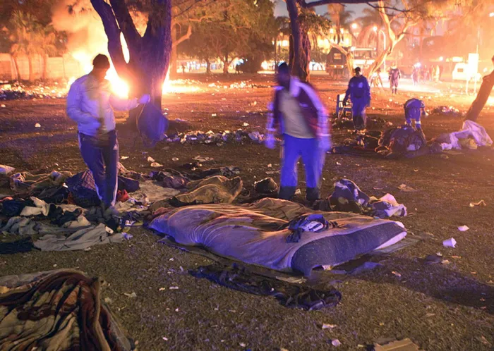 The fire department was called to extinguish several fires, left unattended by the vagrants, which had spread in the park. Meanwhile, Durban Solid Waste workers swept the park and removed piles of rubbish, clothing and blankets. Workers and police threw old mattresses and clothing on to fires.
