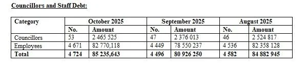 This was a R5 million increase from the September 2025 report on councillor and staff debt. The report presented at a council meeting on Thursday stated that 53 municipal councillors owe R2.4 million, while 4,671 employees owe R82.7 million.
