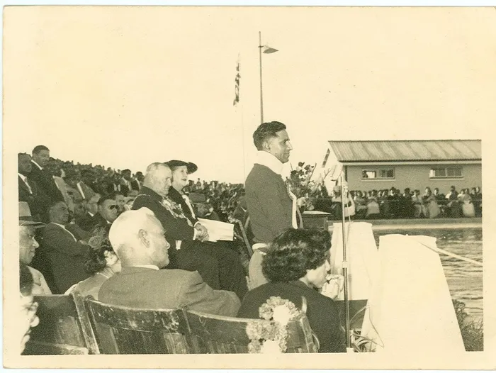 Balkumar Singh addressing the crowd at the opening of the swimming pool in 1957.