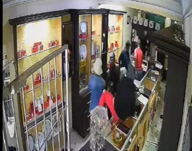 The store's CCTV footage shows one of the men holding open the gate and pointing his firearm at a man standing in the store, presumed to be a customer. A staff member behind the counter raised his hands while four other men rushed in.