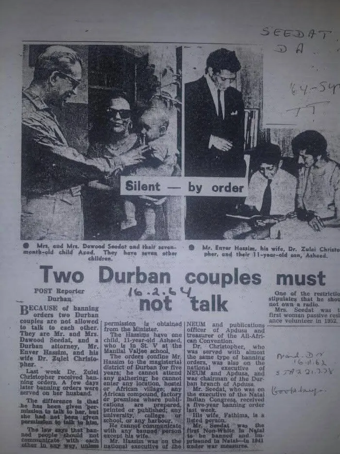 In 1945, Seedat married Fatima, a revolutionary in her own right, who was imprisoned during the 1952 Defiance Campaign. Both Seedat and Fatima were banned for five years in January 1964, under the Suppression of Communism Act.