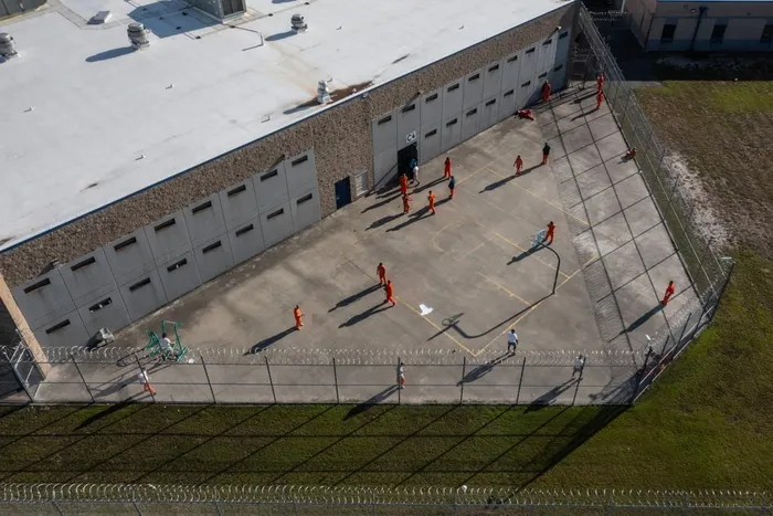 This aerial view taken on September 9, 2025 shows inmates in the yard at the Folkston Immigration and Customs Enforcement (ICE) Processing Center in Folkston, Georgia.