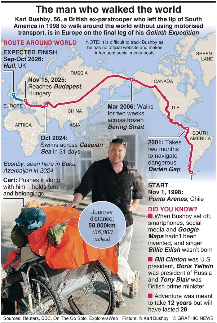 Karl Bushby, 56, a British ex-paratrooper who left the tip of South America in 1998 to walk around the world without using motorised transport, is in Europe on the final leg of his “Goliath Expedition”.