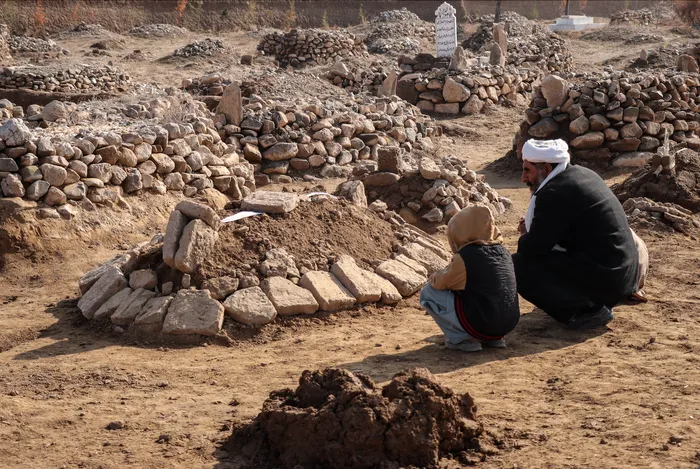 This photograph taken on December 26, 2025 shows Gul Ahmad (R) along with his deceased stepbrother Habibullah's son, Waheed, sitting near his grave in Ghunjan village of Ghoriyan district in Herat province. Iran and Pakistan have combined sent back five million Afghans since September 2023, increasing the country's population by 10 percent, according to the International Organization for Migration.