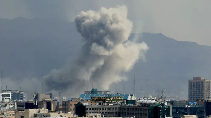 A plume of smoke ascends after a military strike on the capital Tehran, Iran, March 2, 2026.