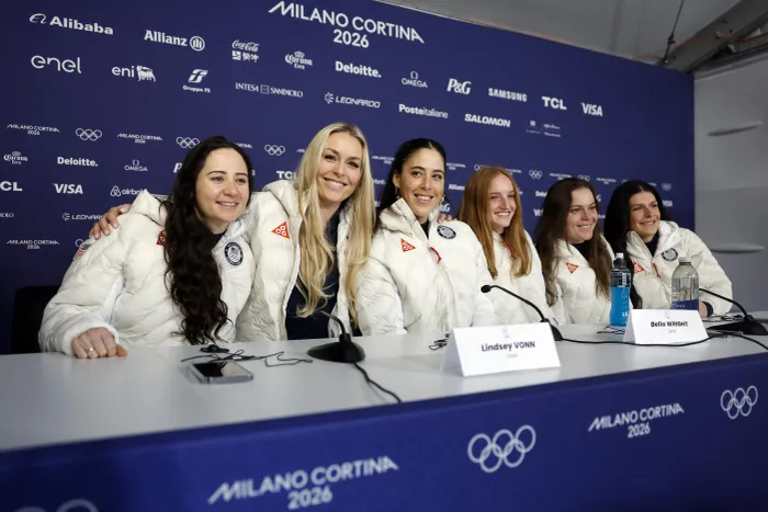 US skiers, from left, Jacqueline Wiles, Lindsey Vonn, Isabella Wright, Mary Bocock, Breezy Johnson and Keely Cashman pose during a press conference ahead of the Winter Olympic Games early this week. The presence of Ice agents to protect US athletes at the games is adding to tensions.