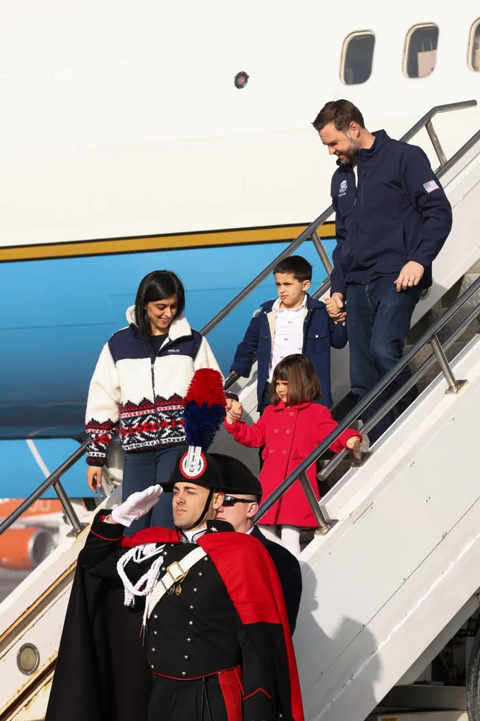 US Vice President JD Vance (R), Second Lady Usha Vance (L), their daughter Mirabel and son Vivek disembark Air Force Two as they arrive ahead of the Milano Cortina 2026 Winter Olympic Games on Wednesday.
