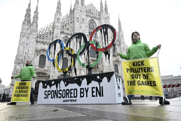 Greenpeace activists stage a protest against Italian oil and gas giant Eni’s sponsorships of the Milano Cortina 2026 Olympic Games at Piazza Duomo this week.