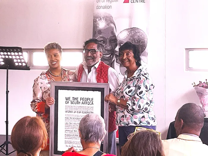 Judge Navi Pillay (right) with fellow DHC Patron Constitutional Court Justice Leona Theron either side of DHC Director Dr Raymond Perrier. They are holding a framed copy of the Preamble to the Constitution which was gifted to the DHC by Justice Albie Sachs.