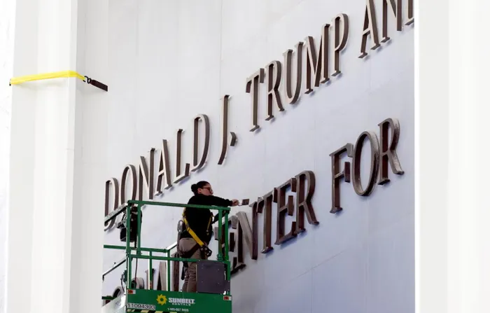 Workers add Donald Trumps name to the Kennedy Centre in Washington.
