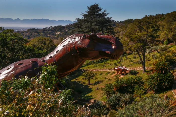 A life size anatomically correct Tyrannosaurus Rex dinosaur sculpture made from tin by David Huni in amongst cycads in the Cycad Amphitheatre at the World Heritage Site Kirstenbosch Botanical Gardens in Cape Town. l EPA/NIC BOTHMA