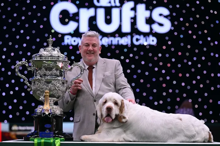 The Clumber Spaniel, Vanitonia Soloist "Bruin" and handler Lee Cox pose for photographs at the trophy presentation after winning the Best in Show competition on the final day of the Crufts dog show at the National Exhibition Centre in Birmingham, central England, this week.