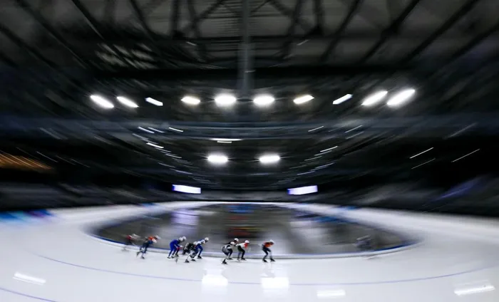 Athletes compete in the Mass Start men juniors race during the ISU Junior Speed Skating World Cup 2025, a test event for Milano Cortina Olympic Games, at Rho Fiera district in Milan on November 30, 2025.