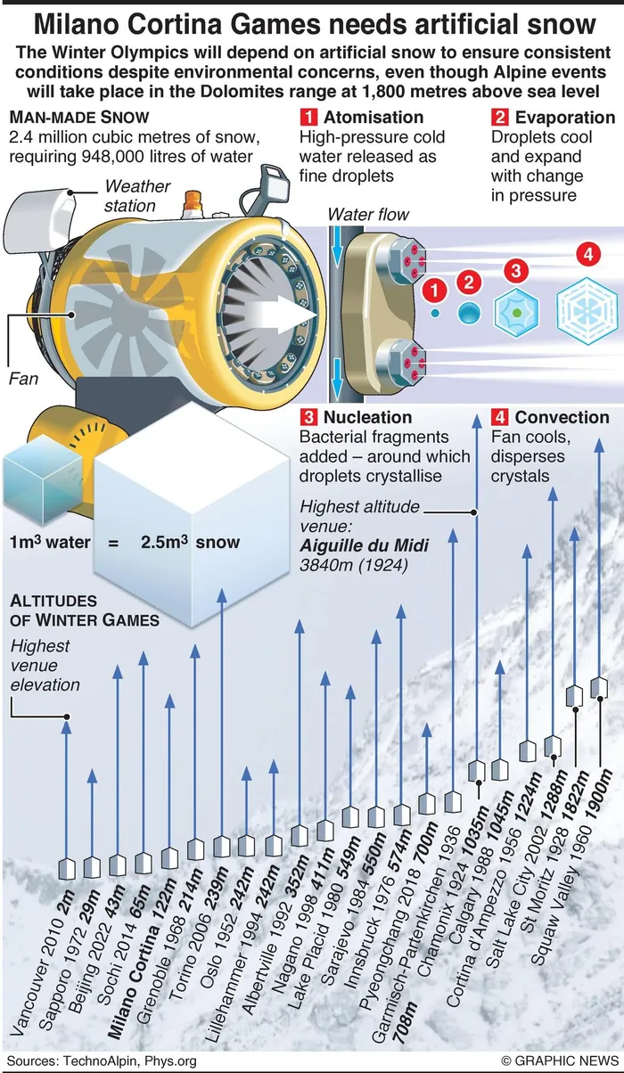 The Winter Olympics will depend on artificial snow to ensure consistent conditions despite environmental concerns, even though Alpine events will take place in the Dolomites range at 1,800 metres above sea level.