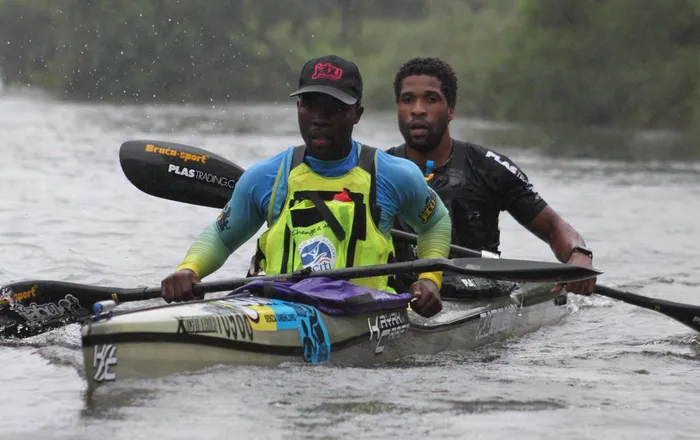 Sandile Mtolo (front) and brother Msawenkosi Mtolo (back) on their way to winning the recent Kindo Covers Ozzie Gladwin as they fired a warning shot ahead of the 2026 Dusi Canoe Marathon form February 19-21.