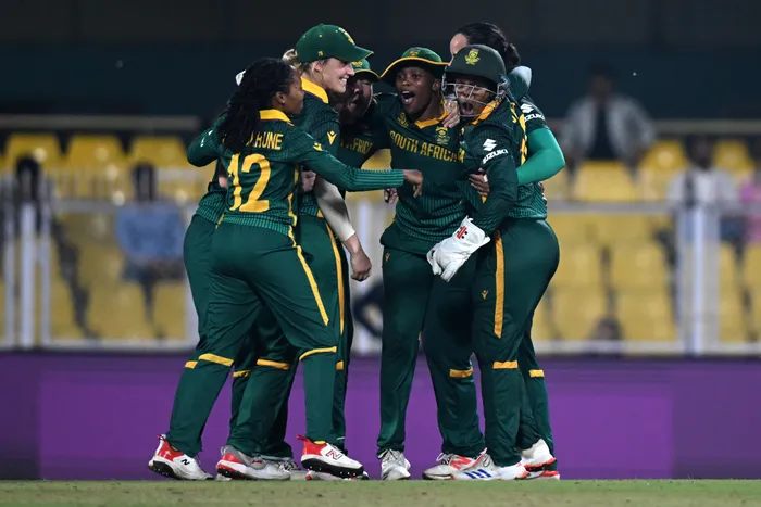 The Proteas Women's team celebrate their epic semi-final victory over England in Guwahati. Picture: ICC
