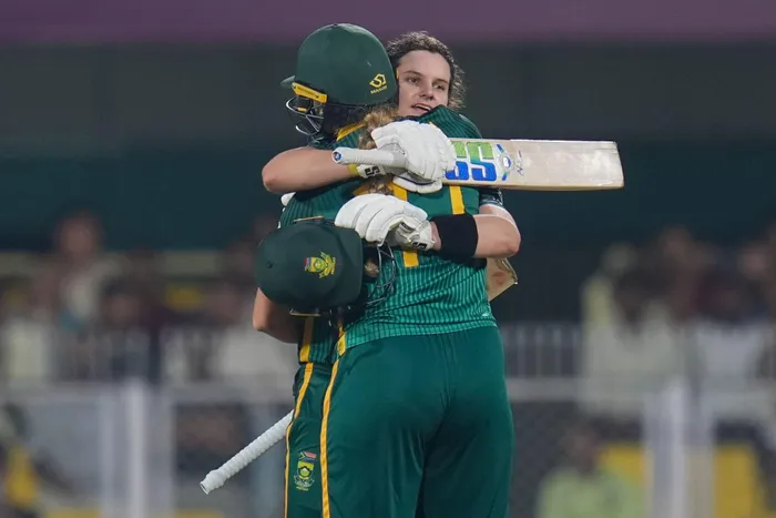Annerie Dercksen congratulates her skipper Laura Wolvaardt on a splendid century. Picture: AFP