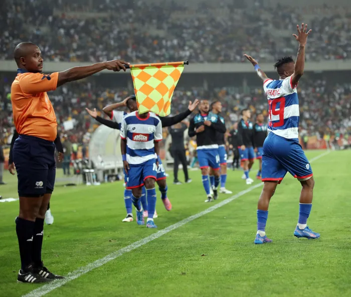 Katlego Maphathe of Durban City reacts after their goal was ruled offside by assistant referee Zakhela Siwela when they thought they had won it against Kaizer Chiefs in the Betway Premiership match at Moses Mabhida Stadium. | BackpagePix