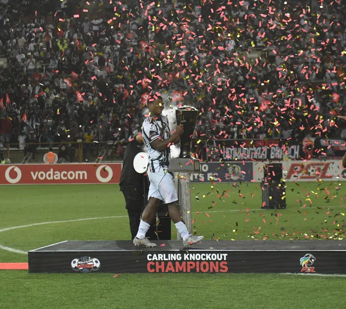 Mbekezeli Mbokazi lifts the Carling Knockout trophy after Pirates’ extra-time win over Marumo Gallants at the Peter Mokaba Stadium. Photo: Backpagepix