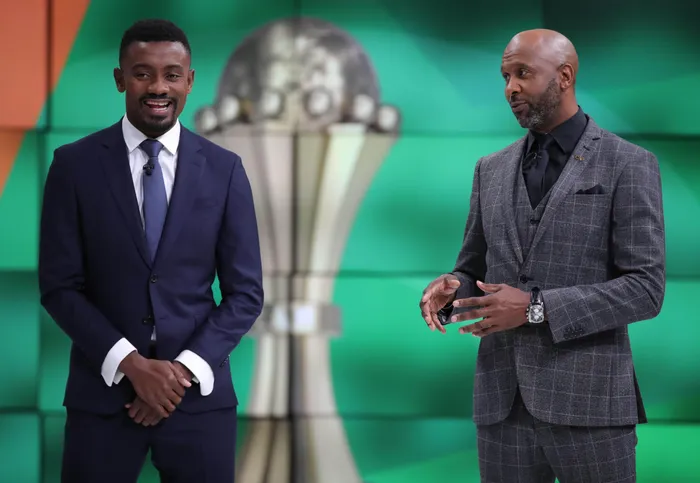 Salomon Kalou and Lucas Radebe during the AFCON 2023 qualifies group stage draw at SuperSport Studio, Randburg on April 2022.