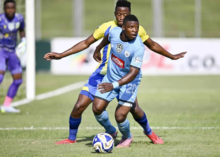 Jean Luwamba of Durban City FC is challenged by Zebulon Mtshweni of Casric Stars FC during the 2026 Nedbank Cup semi-final match at Chatsworth Stadium on Saturday.