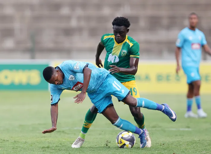 Saziso Magawana of Durban City challenged by Ismael Cisse of Golden Arrows during the Betway Premiership match at the King Zwelithini Stadium in Umlazi on Saturday.
