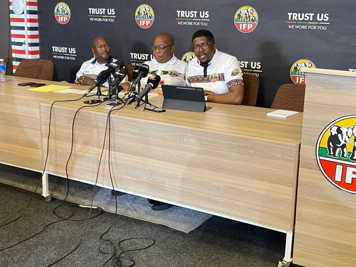 The Inkatha Freedom Party national spokesperson Mkhuleko Hlengwa (right) warns against the uMkhonto weSizwe Party leading the KwaZulu-Natal legislature citing its high leadership turnover as a sign of instability. On the left is Nhlanhla Msimango the IFP's caucus chair and Blessed Gwala, the national chairperson.