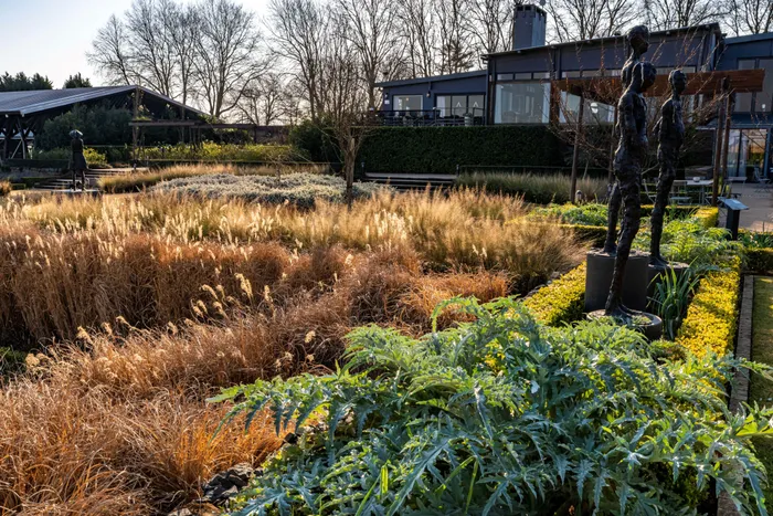 Landscape designer Tim Steyn has used various grasses in the planting, chosen to keep their form in winter and provide warm colour. Sculpture pictured is Silence Needs a Home by Noah Maubane.