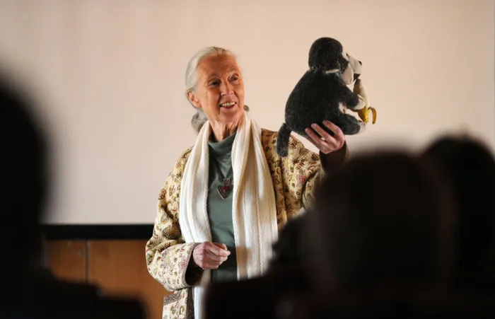 Dame Dr. Jane Goodall talks to the media while holding "Mr H" in the Anglo Gold Board Room at the Johannesburg Zoo about the Jane Goodall Institute and Roots & Shoots. 280711. Picture: Chris Collingridge 544 Dame Dr. Jane Goodall talks to the media while holding "Mr H" in the Anglo Gold Board Room at the Johannesburg Zoo about the Jane Goodall Institute and Roots & Shoots. 280711. Picture: Chris Collingridge 544