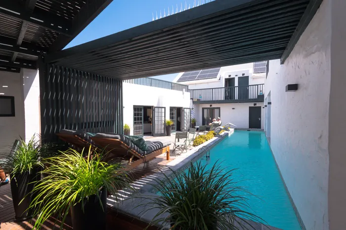 The private patio overlooking a heated pool is set in a wind-free enclosed courtyard.