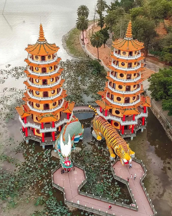 The Dragon and Tiger Pagodas on Lotus Lake in Kaohsiung, Taiwan, are a famous landmark where visitors enter through the dragon's mouth and exit the tiger's mouth to turn bad luck into good fortune.