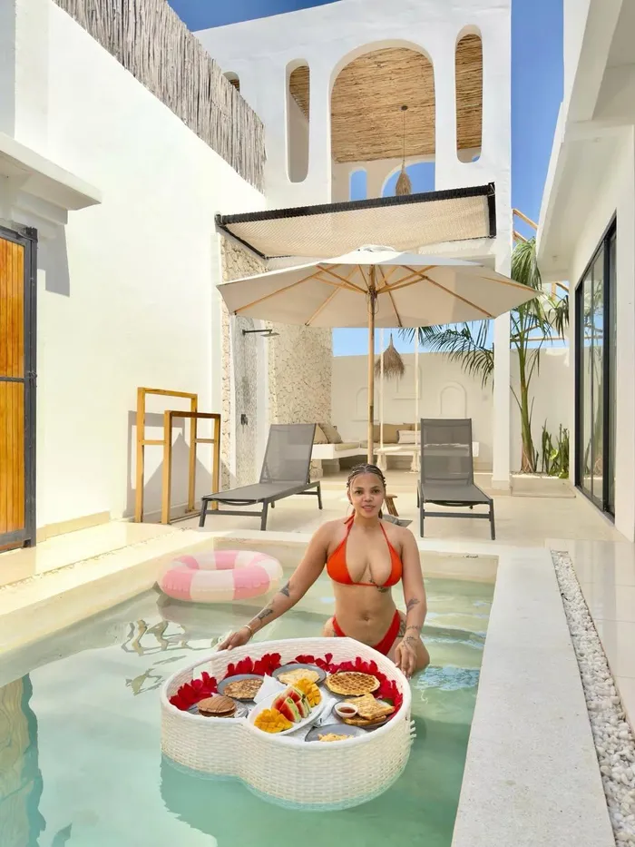 The reality TV star indulged in a luxurious stay at Villa Mushu, complete with stunning pools and the delight of a floating breakfast.