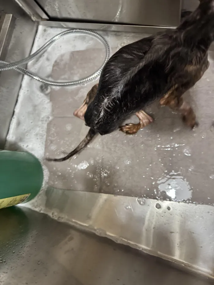 Apple getting a bath. Georgia Dodson described her as "skin and bones" when she was first rescued.