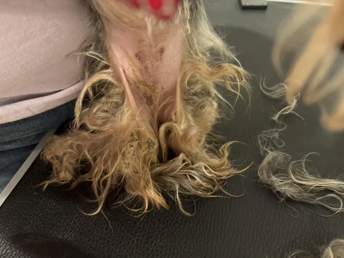 “Her healthy weight is nine or 10 pounds,” Dodson said. “She’s very thin, her coat was completely matted and covered in excrement and all types of things I had to literally shave off.”