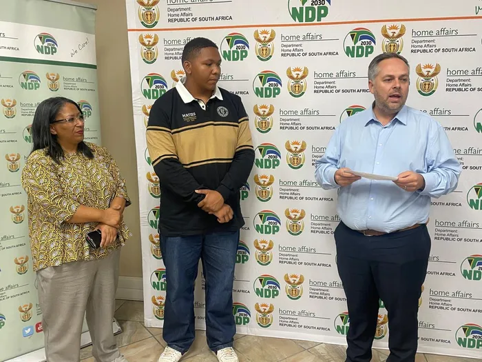Home Affairs minister Leon Schreiber describing the significance of the ID of !Khūboab Lawrence, the first with special characters. Next to Lawrence is his mother Lesle Jansen.
