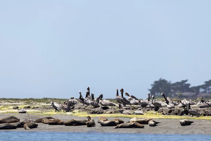 Sea lions and California brown pelicans rest at Elkhorn Slough.