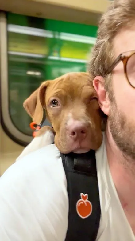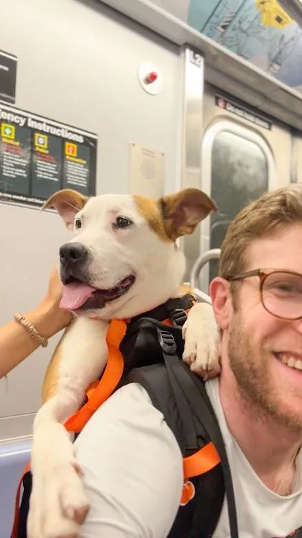 The man carrying her was not her owner, but a volunteer of sorts. Bryan Reisberg spends one day a week taking shelter dogs like Bertha out of their kennels, lifting them into a rucksack that says “adopt me” and bringing them onto the subway and around New York. His goal is for people to see shelter dogs as he does: curious, sweet, and a potential pet.