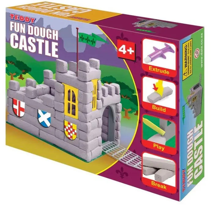 Teddy Fun Dough Castle lets you be the king of your own castle with this build and play Teddy Dough set. Includes all the tools and materials needed to build your very own fun dough fortress. The Teddy Fund Dough Castle consists of 1 kg of grey dough; 2 x windows; 1 x drawbridge; 1 x extruder; 1 x spatula and 1 x baseboard to build on.