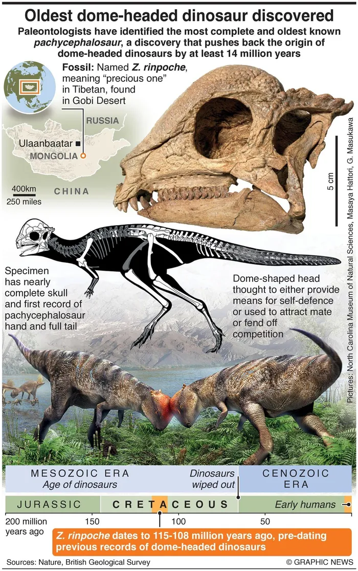 The fossil, named Zavacephale rinpoche – with “rinpoche” meaning “precious one” in Tibetan – was unearthed in the Gobi Desert of Mongolia. Dating to between 115 and 108 million years ago in the Early Cretaceous, the specimen predates all previously known dome-headed dinosaurs by a significant margin.