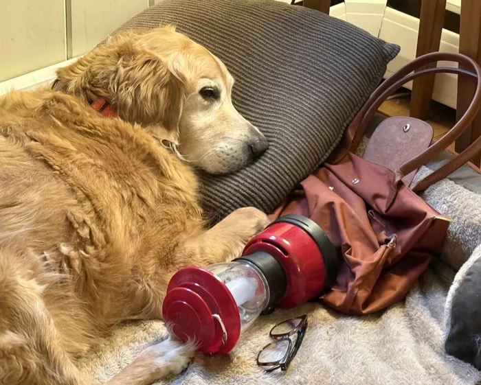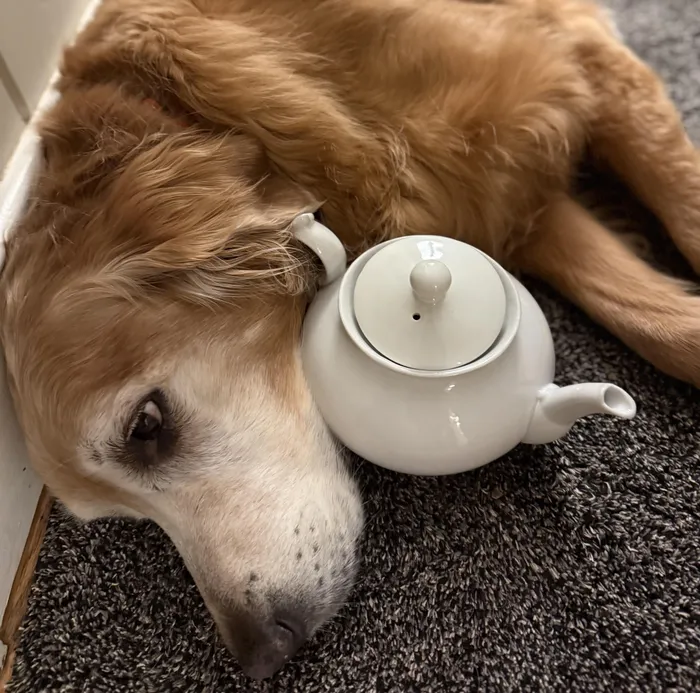 Duke, an 11-year-old golden retriever, guards a teapot.