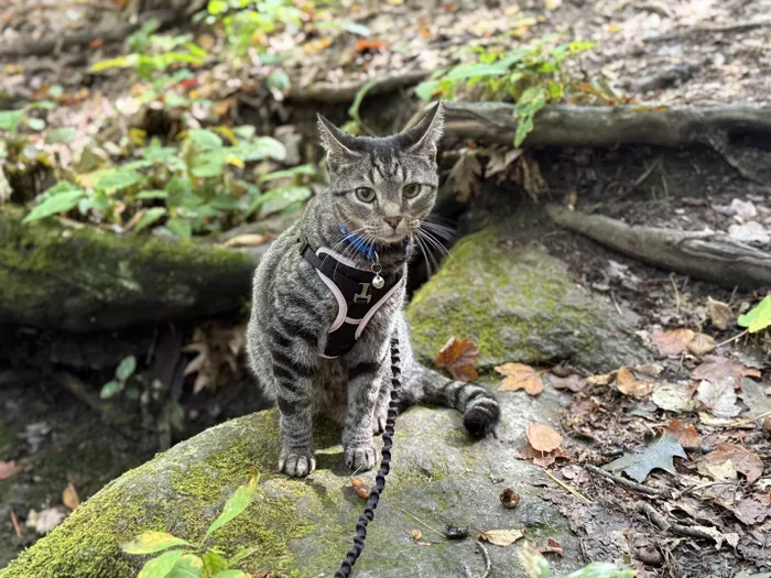 Ray Ray seemed to adjust quickly to being a traveling cat, hopping in and out of the backpack and walking on a leash around tourist attractions in New England and New York.