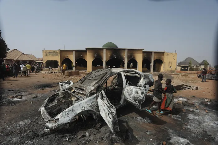 Two girls stand next to a burnt car at the Bungha Central Mosque in Mangu on February 2 last year, following weeks of intercommunal violence and unrest in the Plateau State.