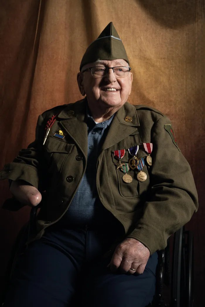 Russell Sattazahn, 99, lost his right hand in March 1945. “I was over there. I saw the heroes,” he told an audience, choking back tears. “I came home.”